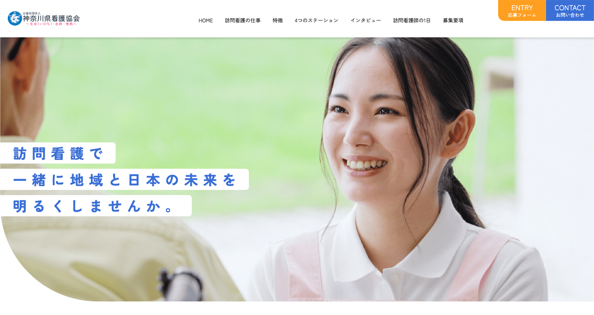 公益社団法人 神奈川県看護協会様のご依頼で、訪問看護師を募集する専用サイトを制作させていただきました。求職者に仕事の内容や職場の雰囲気をお伝えするために、4カ所の訪問看護ステーションに伺い、密着取材とインタビューを行いました。現場で働く看護師さんたちのリアルな声をお載せすることで、理解を深め好意をもって応募していただけるように努めました。