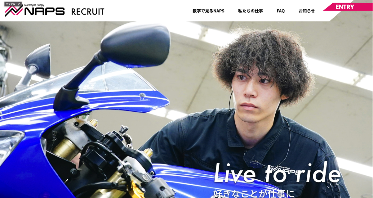 日本最大級のオートバイ用品専門店として全国に展開する株式会社ナップス様の新卒採用サイトと採用動画を制作させていただきました。ご登場いただいた社員の皆さまにはインタビューを行い、WEBライティング、デザイン、動画撮影・編集に至るまで、サイト全体から「バイク愛」が伝わり、ターゲットに響くように組み立てました。